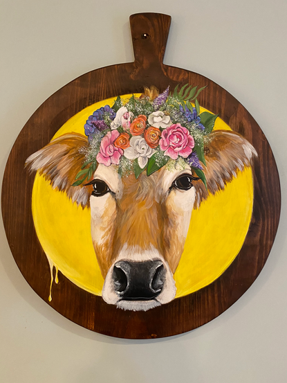 While we were living in Germany, I would venture out to these antique stores, and flea markets with my friends. There would be stacks of refurbished bread boards everywhere. I'm not exactly sure why there's such a desire for these boards, maybe because of their shape, and with some of the older ones a bit of character. I think they look great mixed in with a collage wall. The round board is just aesthetically pleasing to me. It adds a different texture, and shape to the walls. My dear friend, Rebekah, gave me the idea to start painting on them. I had never painted on a bread board before. I had no idea what I'd actually paint, but I was definitely intrigued. This was the spark that ignited my next series of paintings, cows.